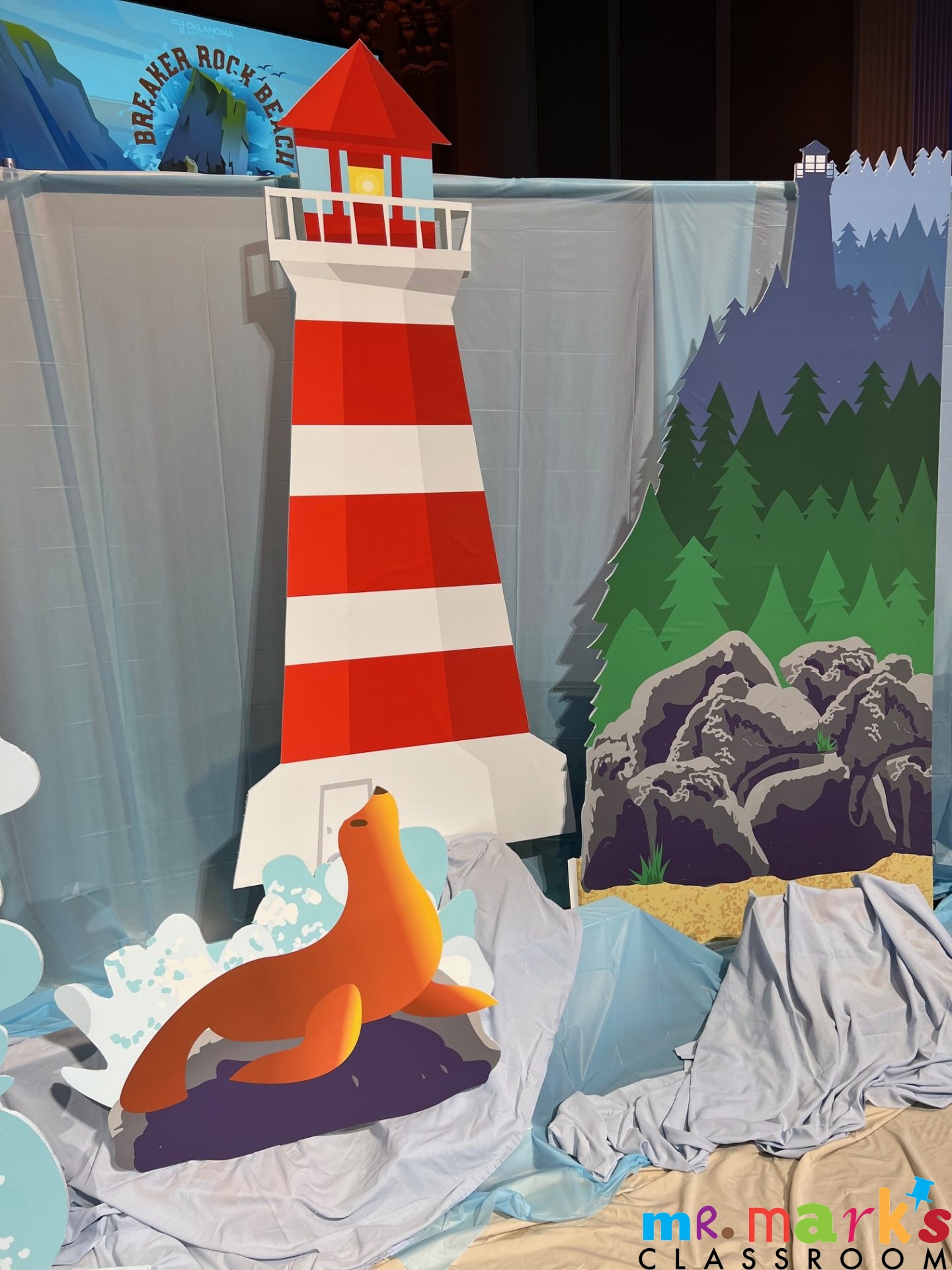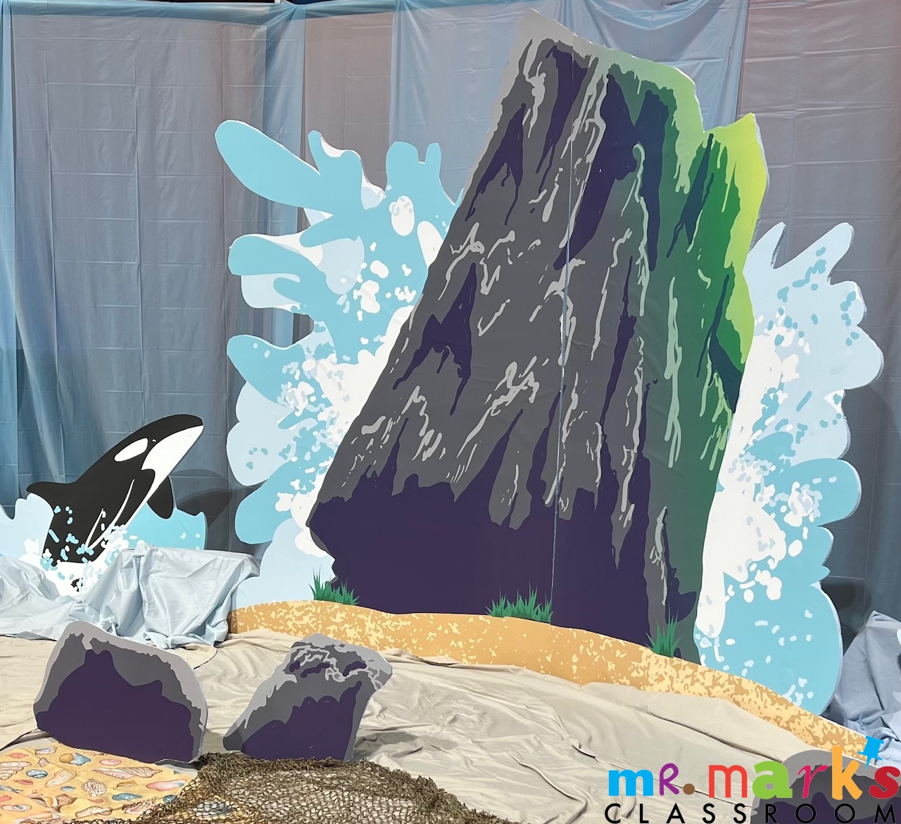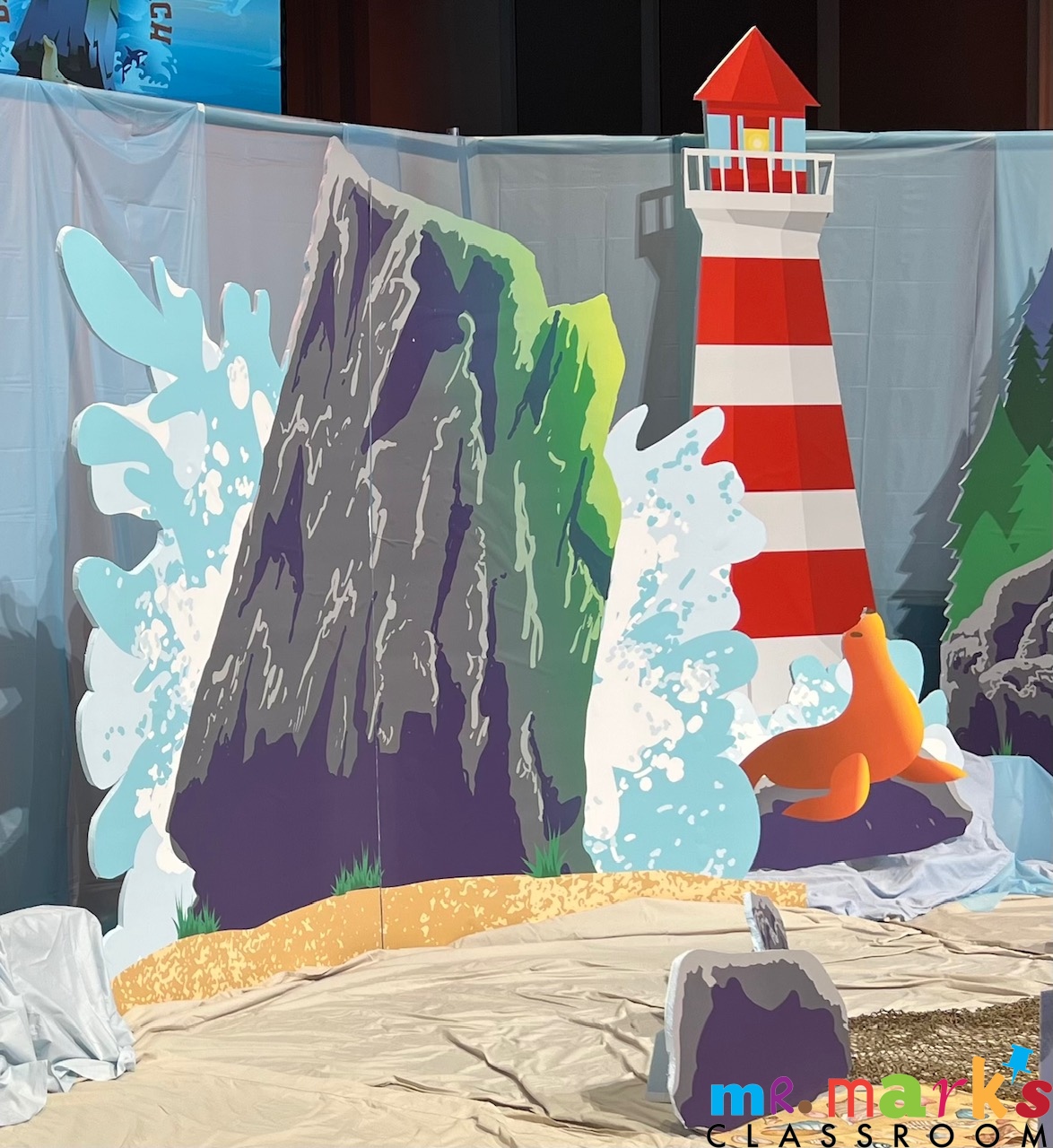 Here’s the full stage decoration to bring your VBS theme to life. This includes the Breaker Rock panels with the seal and orca plus two more panels for each side of your stage to frame the scene and large rocks that match the Breaker Rock to give your scene more depth and a three dimensional appearance. The Large Stage Set has a total of four large sticker panels, 4’x 8’ each, featuring trees, rocks and a lighthouse in the distance.