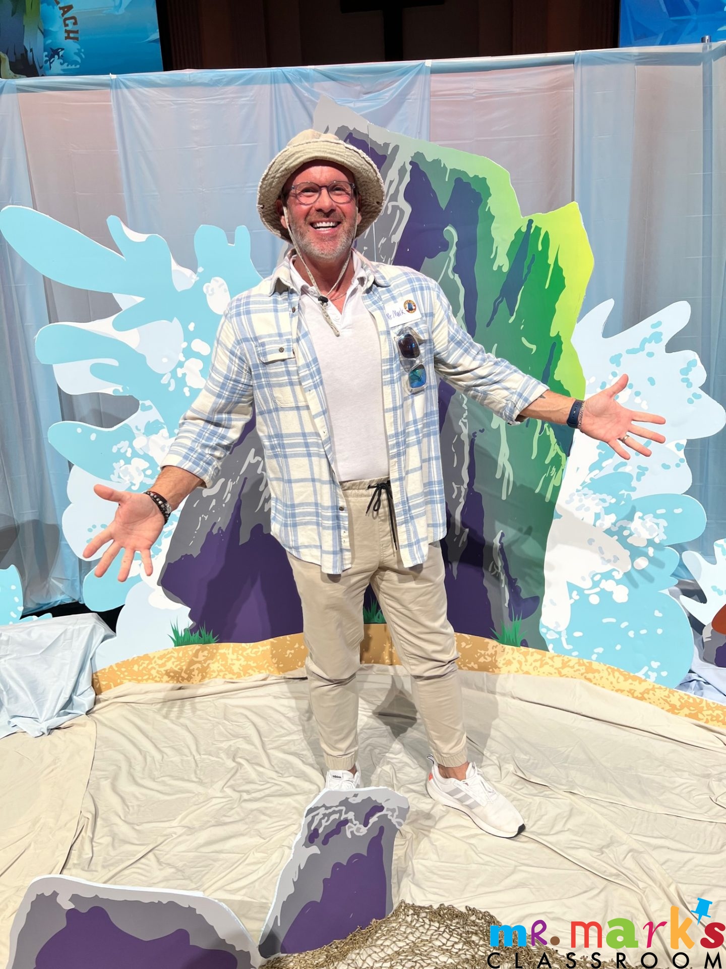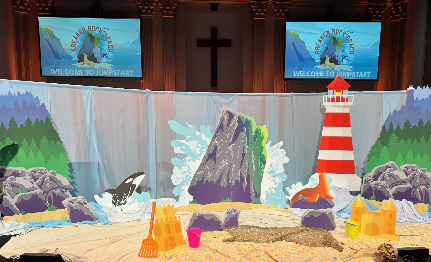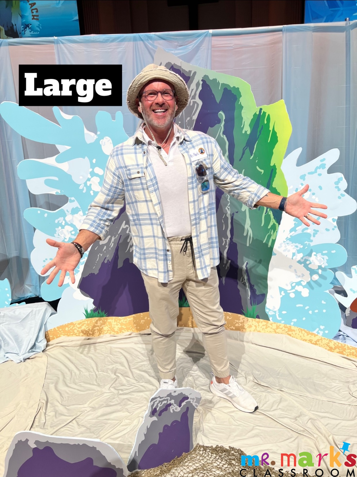 Here’s the full stage decoration to bring your VBS theme to life. This includes the Breaker Rock panels with the seal and orca plus two more panels for each side of your stage to frame the scene and large rocks that match the Breaker Rock to give your scene more depth and a three dimensional appearance. The Large Stage Set has a total of four large sticker panels, 4’x 8’ each, featuring trees, rocks and a lighthouse in the distance.